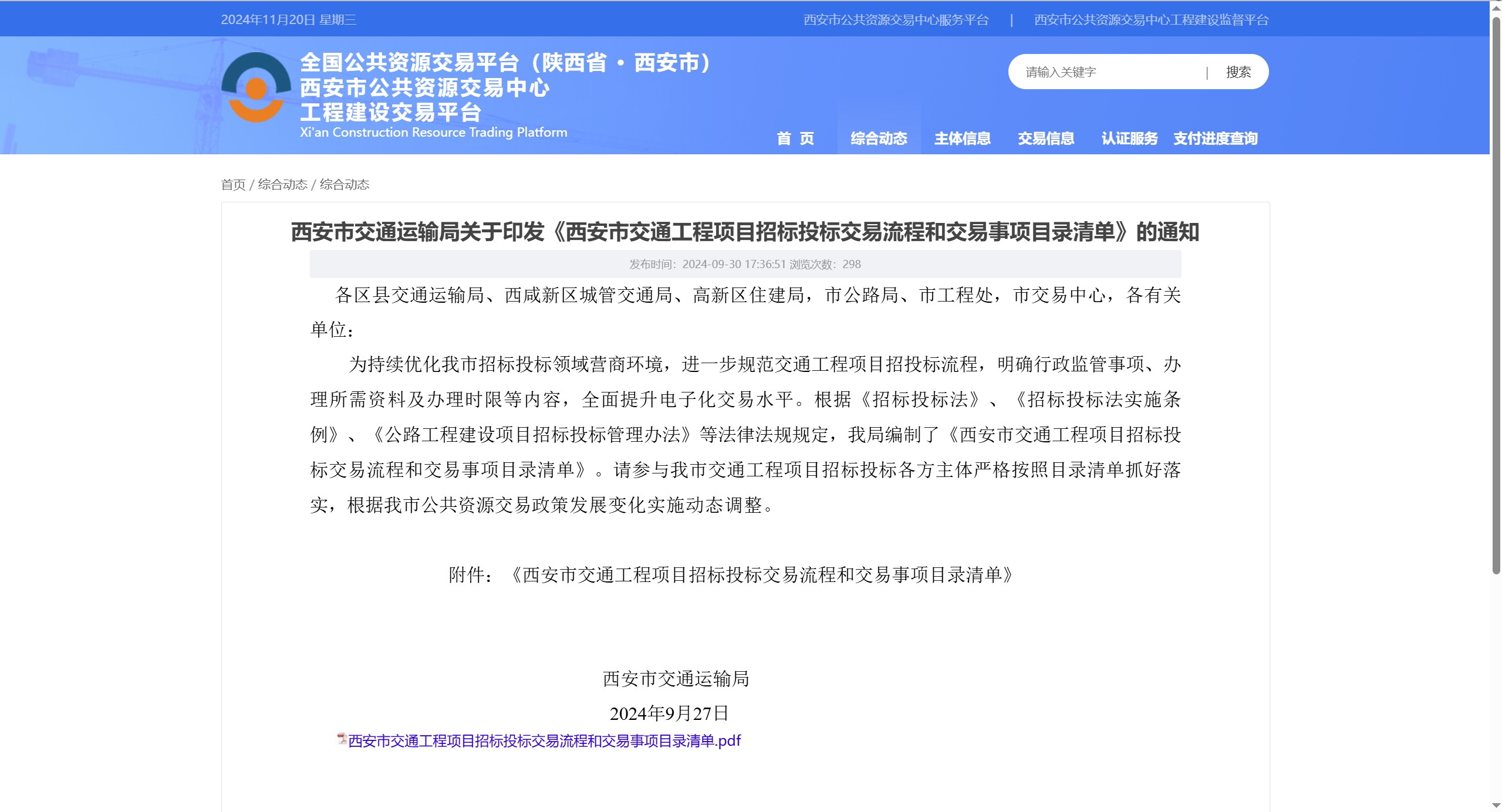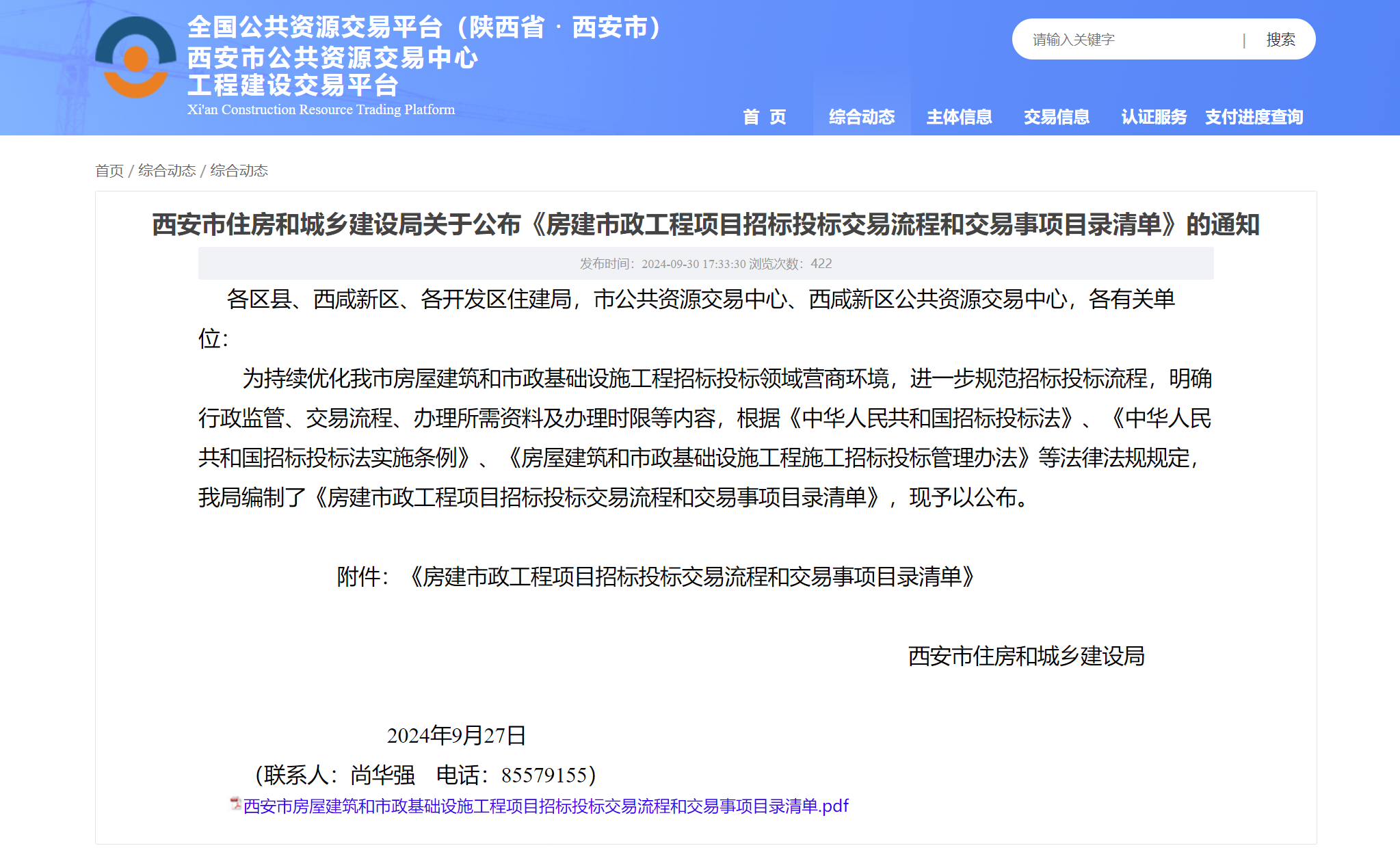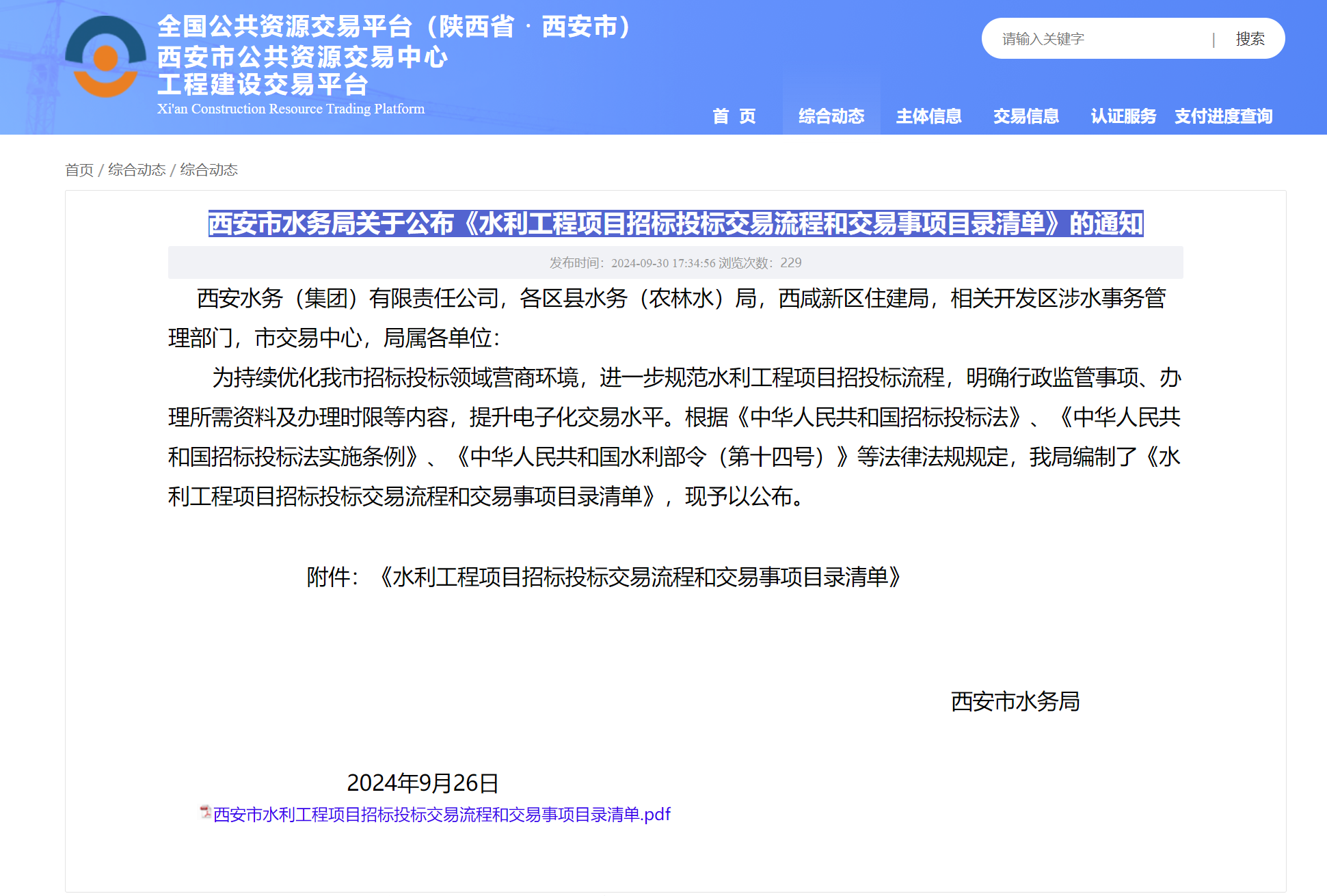 西安市水务局关于公布《水利工程项目招标投标交易流程和交易事项目录清单》的通知